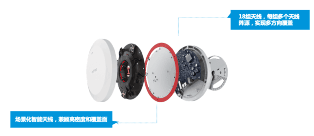 这是四射频AIRadio设计的无线AP,它采用了太空舱设计,拥有超密集的十八条流天线,整机速率可达16.417Gbps,性能超出业界产品53%,同时还可兼顾高密度和广覆盖特性。