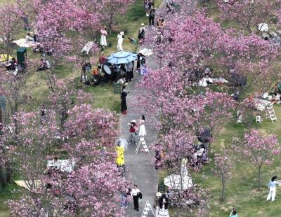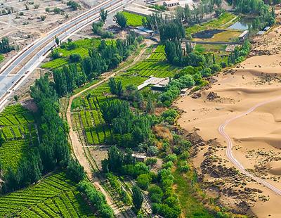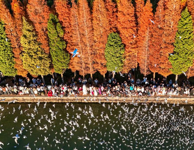 考察队员在研究恐龙足迹(2020年11月9日摄,无人机照片)。新华社发