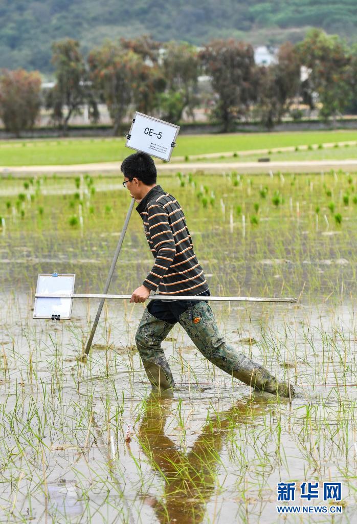 3月29日,华南农业大学国家植物航天育种工程技术研究中心王加峰博士为刚刚插秧太空稻的试验田插上写着“CE-5”的标识牌,这是嫦娥五号的拼音缩写。新华社记者刘大伟 摄