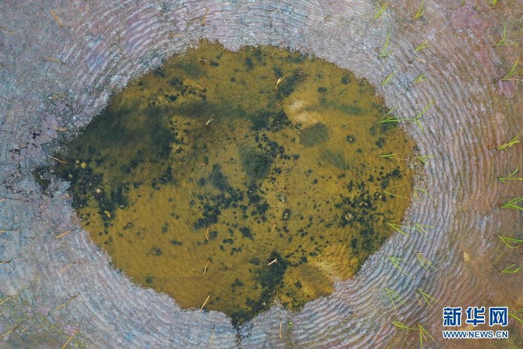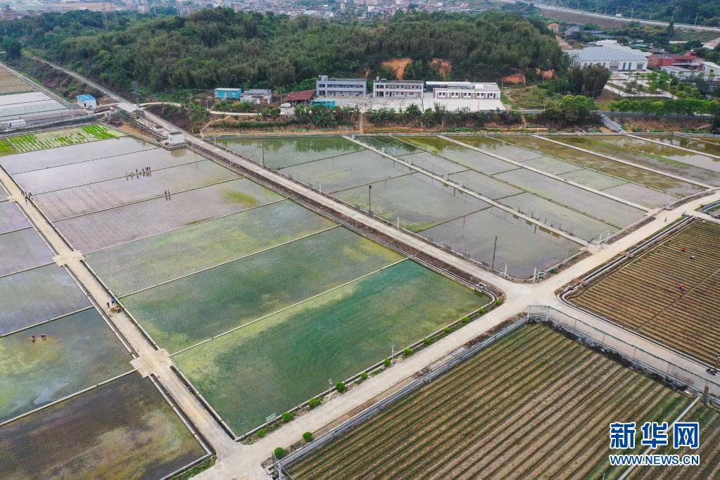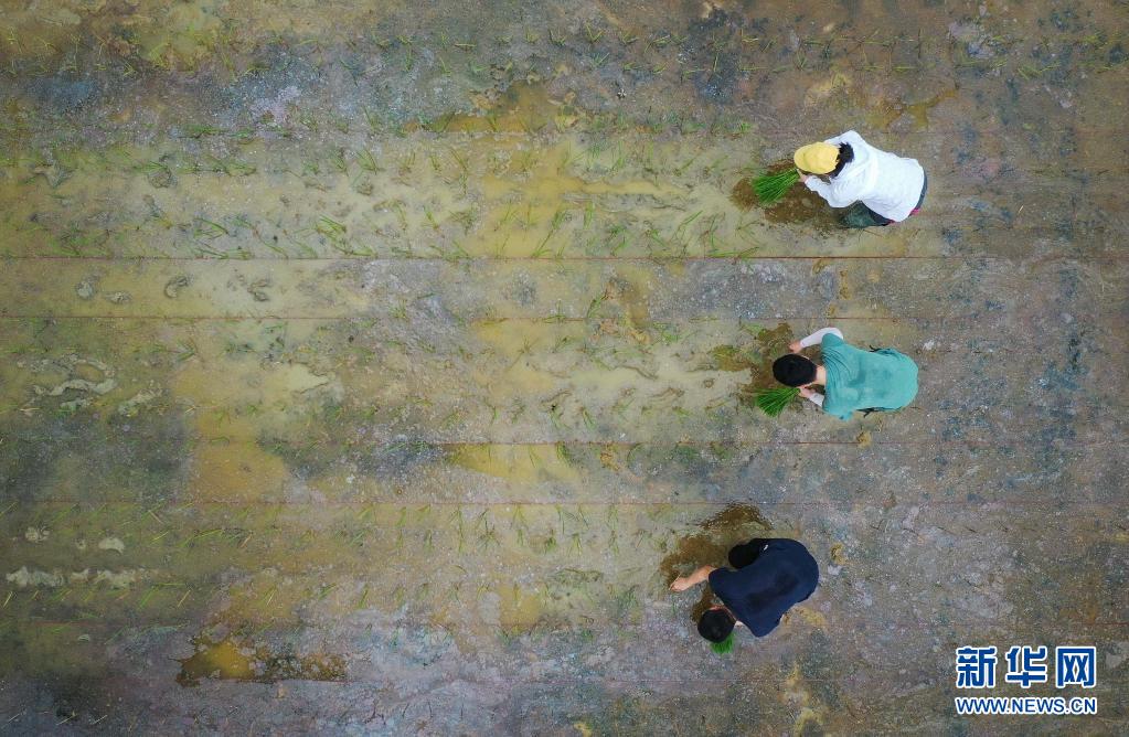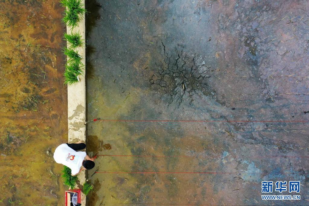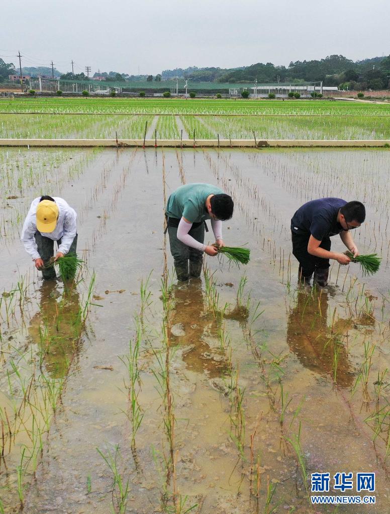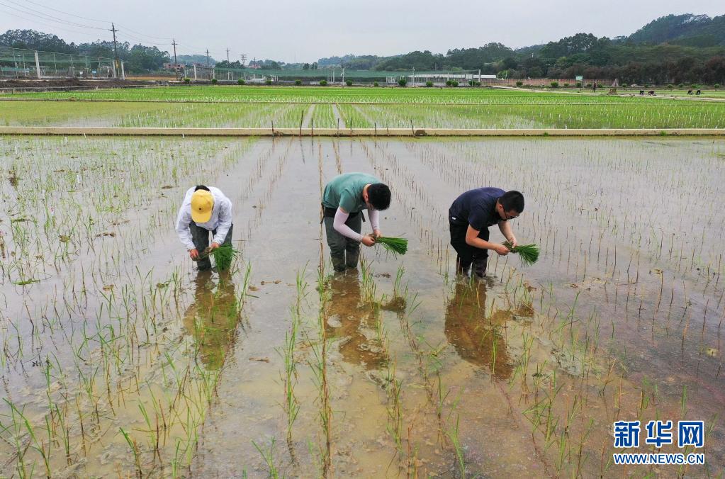 3月29日,研究人员在广州增城华南农业大学试验田准备插种嫦娥五号搭载的太空稻秧苗(无人机照片)。新华社记者 刘大伟摄