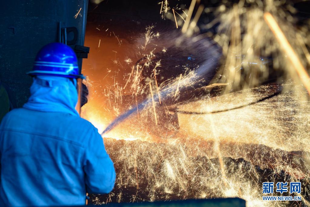 7月24日,工人在首钢水钢公司铁焦事业部四号高炉出铁水时洒水降尘。