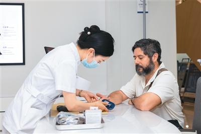 2025年5月14日,外国体验者在湖南省长沙市三诺健康糖尿病门诊体验慢病多指标快速检测。受访者供图