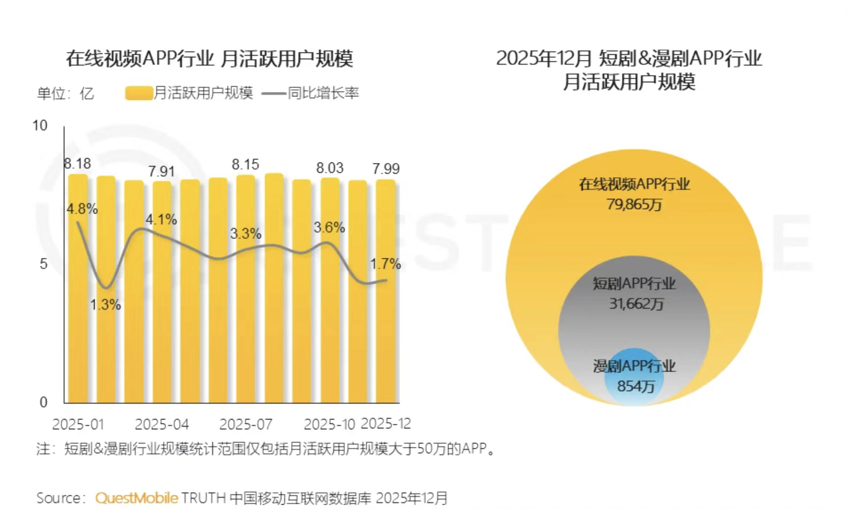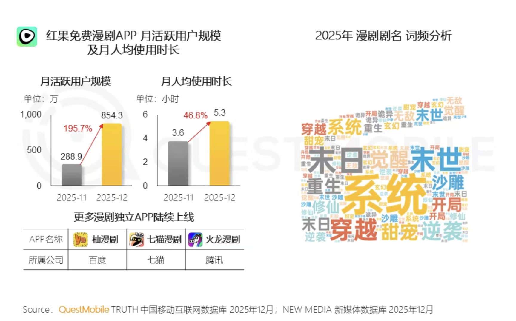 报告显示,2025年12月,在线视频APP行业月活为7.98亿,短剧APP行业月活为3.16亿,而漫剧这一细分领域正以惊人速度崛起,月活跃用户数达845万,突破800万大关。其中,红果免费漫剧APP单月净增用户超500万,月人均使用时长环比飙升46.8%,市场热度可见一斑。
