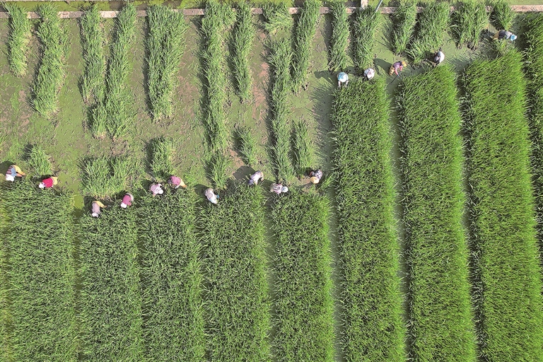 农民在云南曲靖麒麟区文华街道的农田里起茭白苗。新华社发